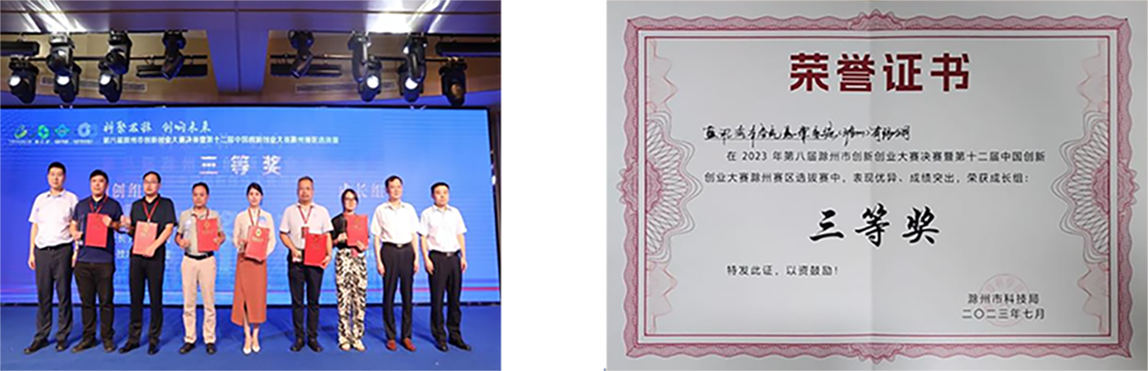 2023年7月11日,第十二届中国创新创业大赛滁州赛区选拔赛暨第八届滁州市创新创业大赛在中新苏滁高新区正式开启。 我司以苏滁区选拔赛第一名的成绩进入滁州总决赛,并荣获滁州赛区成长组“三等奖”,这是我司在科技创新领域做出的成绩之一。